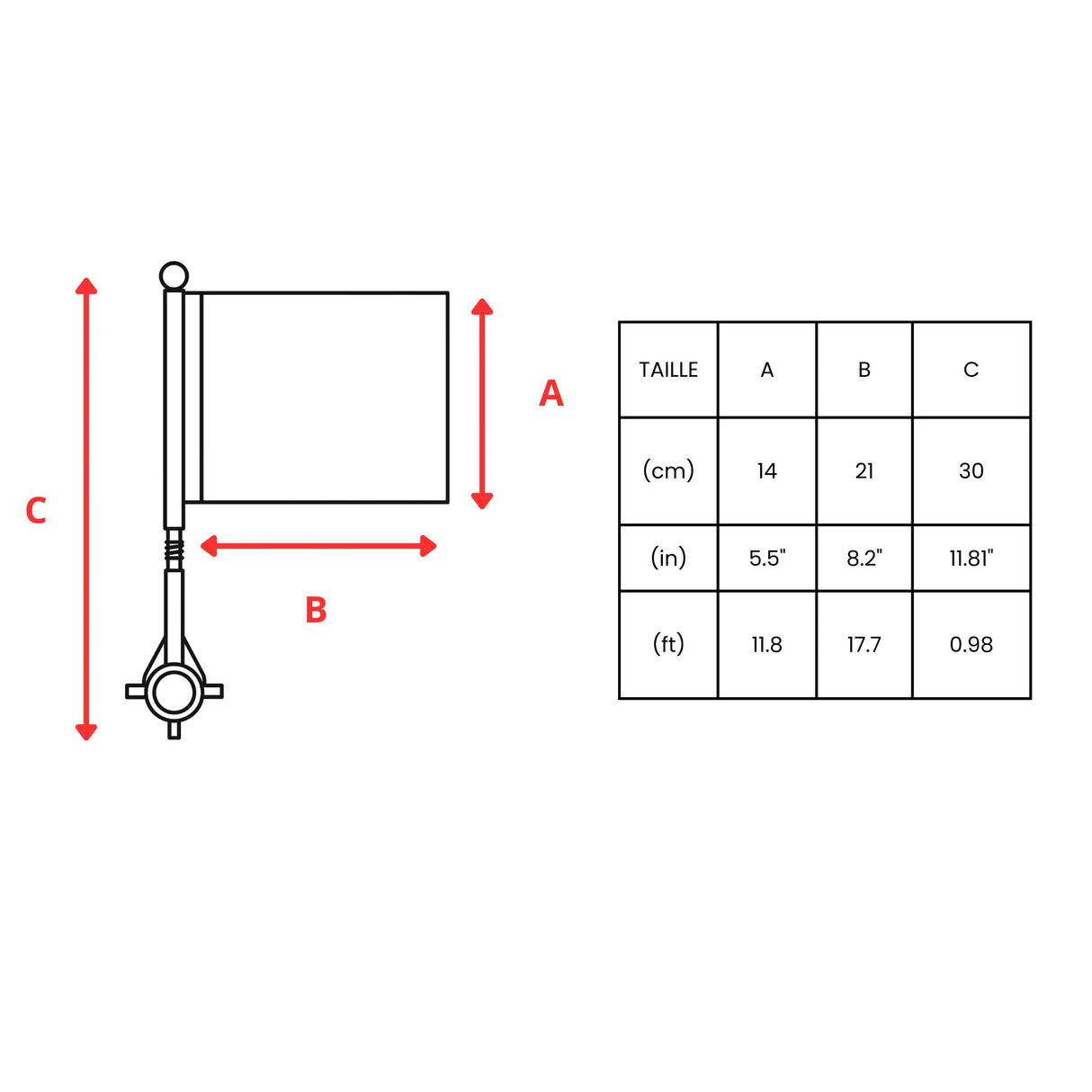 • ध्वज का आकार: 14 x 21 सेमी (5.51 x 8.26 इंच या लगभग 0.45 x 0.68 फीट) - बाइक का वज़न बढ़ाए बिना बेहतरीन दृश्यता के लिए बिल्कुल सही अनुपात में।